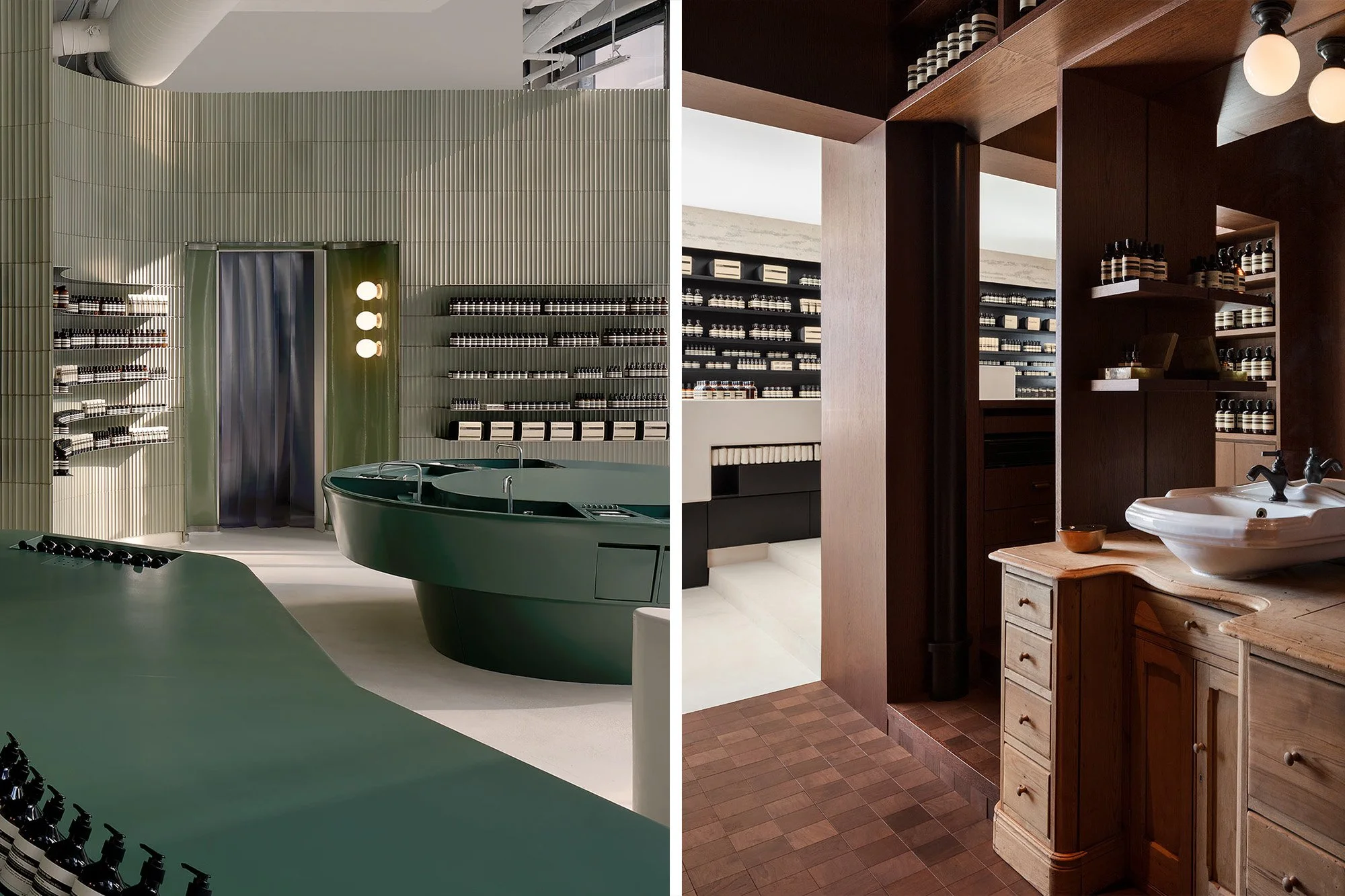Des espaces différents. Une signature. GAUCHE : © Aesop, boutique Seaport, Boston. DROITE : © Aesop, boutique Kamakura, Kanagawa.