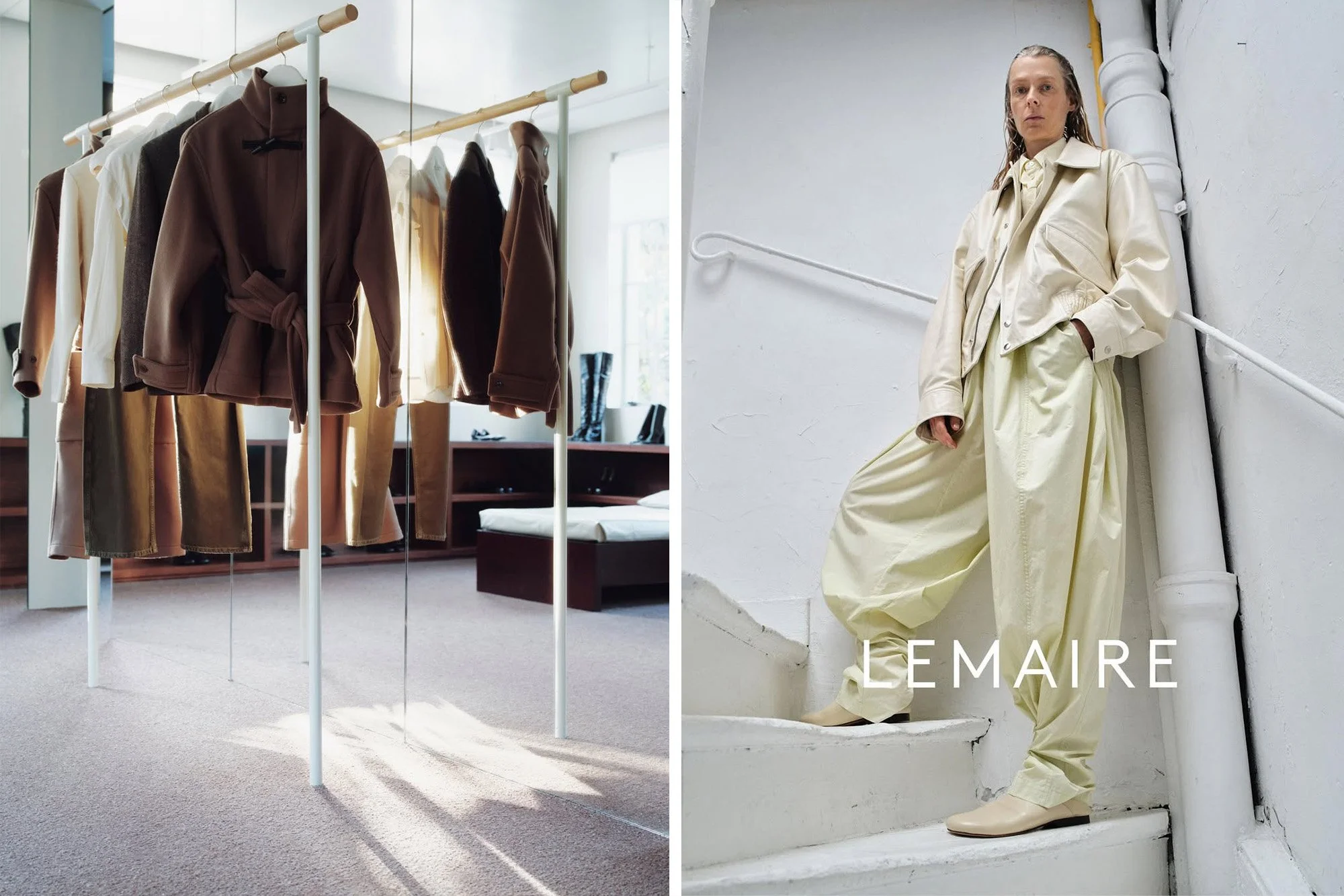 Le rythme est la posture. GAUCHE : © Lemaire, flagship Wukang, Shanghai, 2026, photo Rino Qiu. DROITE : © Lemaire, SS 2025, photo Pegah Farahmand.